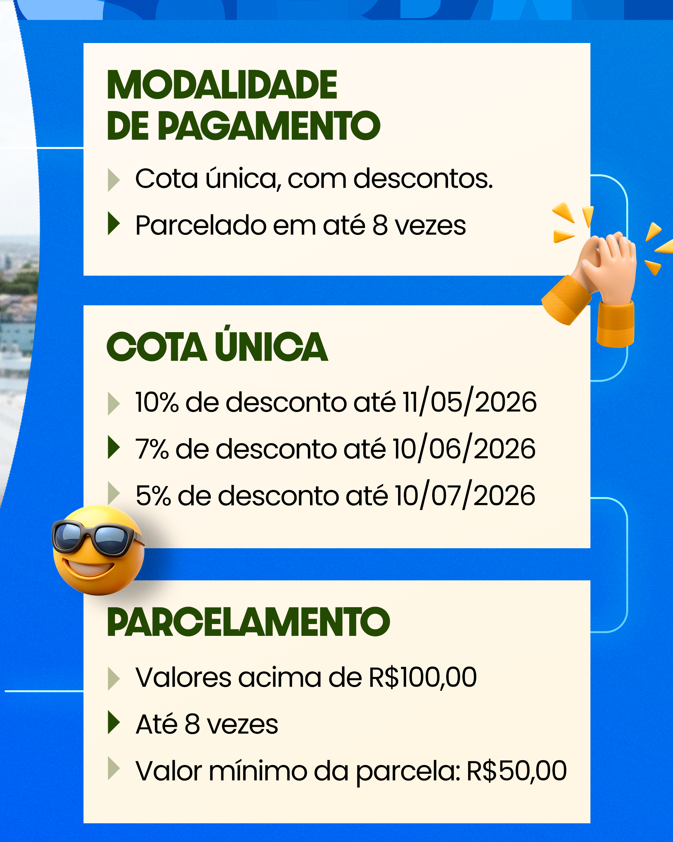 Na opção de pagamento parcelado, as parcelas poderão ser emitidas por meio do endereço eletrônico iptu.sobral.ce.gov.br ou presencialmente no Espaço do Contribuinte, localizado no Sobral Shopping, ou no Vapt Vupt.
